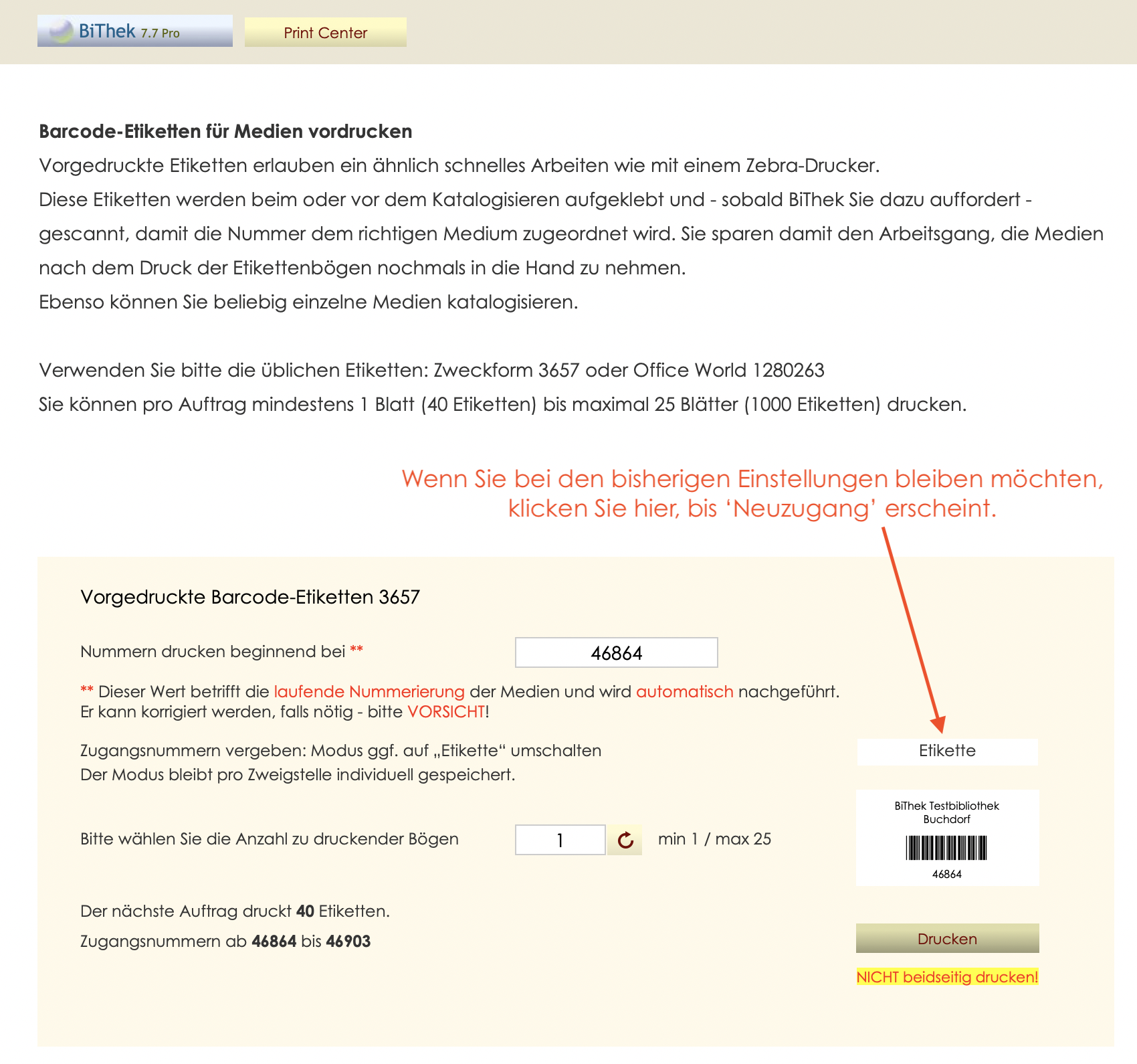 ’Neuzugang’ = BiThek vergibt die Nummern automatisch und fortlaufend beim Katalogisieren. Diese Einstellung ist für den Etikettendruck NACH dem Katalogisieren oder für Zebra-Etikettendrucker.